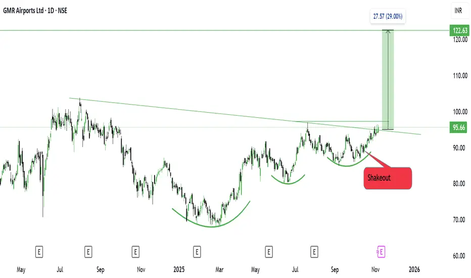 GMR Airports is setting up a classic 3T Volatility Contraction Pattern (VCP) on the daily chart. The stock has gone through three clean contraction phases, each with tighter price swings and reduced volatility — a textbook sign of institutional accumulation.