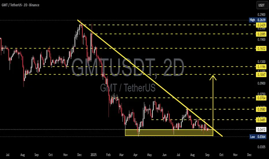 Since the early 2025 peak, GMT has been in a clear downtrend, consistently forming lower highs along the descending trendline (yellow).