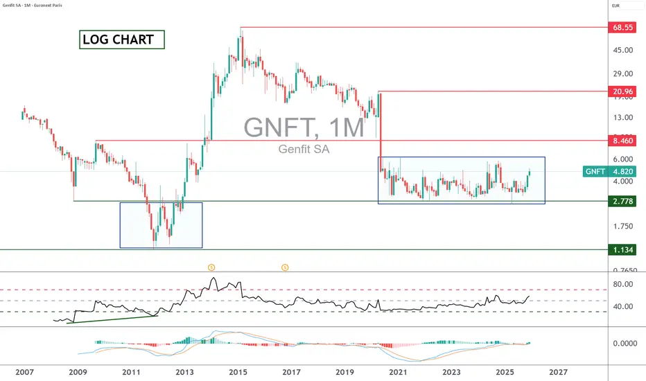 For nearly five years, Genfit’s share price has been moving within a broad consolidation zone between €3 and €6, forming a horizontal accumulation base on the long-term timeframe represented here by monthly candlesticks. This type of pattern, especially visible on a logarithmic chart, often appears after a long downtrend and can form the foundation for a sustainable bullish reversal if and only if prices eventually break out to the upside.