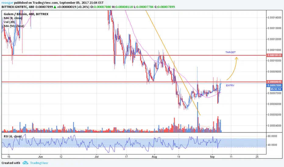 GOLEM is feeling bullish after a consolidation phase, and a series of higher lows. Pink MA pushing up. Enter at a pull back, and target as described. GL!