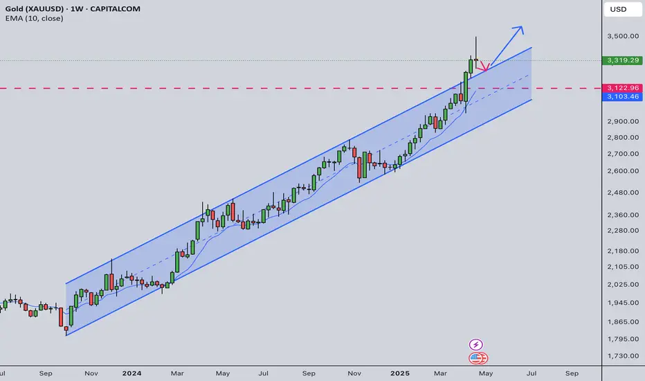 Last week I predicted gold would go up first and down afterwards and closed the week with a red candle. However, instead of 3400, gold touched 3500 and closed the week at 3319 with a red candle. I consider this as retrace rather than trend reversal. The overall bullish trend still valid.