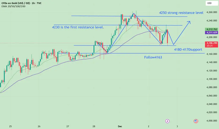 Gold is once again exhibiting a typical bottom-rebound pattern. After falling to a low of around 4181 during the day, it quickly stabilized and began to rebound. Gold's movement during the US trading session was consistent with our predictions, touching 4230 but failing to break through and hold. We once again seized the opportunity, with our short positions yielding substantial profits. We will continue to look for buying opportunities at lower levels. Gold bulls still have the potential for further gains, but this should not be a blind pursuit of the rally. Looking at the 4-hour chart, key resistance levels are at 4230 and 4250, two important resistance areas that bulls must break through. On the downside, the support level at 4180-4170 is our first entry point for long positions, while also paying attention to a break below 4163, which is the core support level in the current structure. As long as this level holds, the bullish momentum will remain intact, and the overall trend will continue to develop upwards within the range. The more thorough the pullback, the clearer the opportunity.