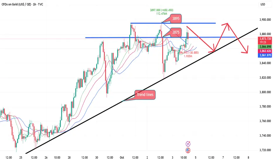 Our overall judgment on gold in October is "bumpy", that is, the market has turned from the steady slow bull market in September to a fluctuating rise. There will be a tug-of-war between long and short positions, and there will be a tug-of-war between highs and lows and a rapid rebound. However, this does not mean the end of the bull market, but only a change in the rising rhythm. We should pay attention to this pattern change in the short term. We will still view it as a strong rhythm during the day. After the volatile upward trend in the Asian and European sessions, we will choose to follow up with a bullish trend after a pullback. Pay attention to the suppression around 3874 and 3895 on the upside. At the same time, due to the uncertainty of the non-farm payroll results, whether it is announced or not will have a greater impact on today's operations.