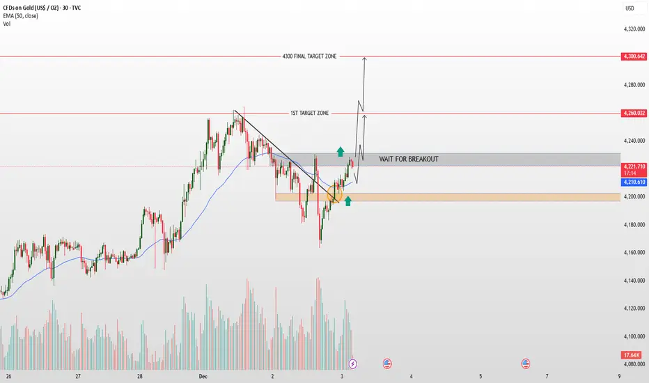 Price is currently trading just above the broken descending trendline, indicating early signs of bullish momentum. The recent retest of the breakout zone (highlighted area) has held as support, suggesting buyers are defending this level. Price is now approaching the 4,223–4,240 resistance zone, where a clear breakout and confirmation would strengthen bullish continuation toward the 1st target zone around 4,260.