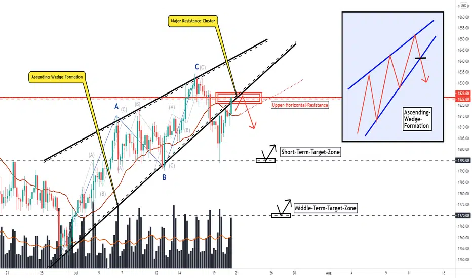 As when looking at my chart we can watch there how GOLD has developed this massive ascending-wedge-formation on the 4-hour term. In this formation, GOLD has a coherent wave-count which already completed with the waves A to C and had a meaningful reference-point in this wedge which is the 20-EMA above which the price-action within the wedge developed. Now as GOLD moved below the lower boundary and below the 20-EMA this zone is serving as resistance. GOLD has established this major resistance-cluster in the structure marked in my chart in red where several resistances coming together consisting of the upper-horizontal-resistance and also the lower boundary of this whole wedge-formation.