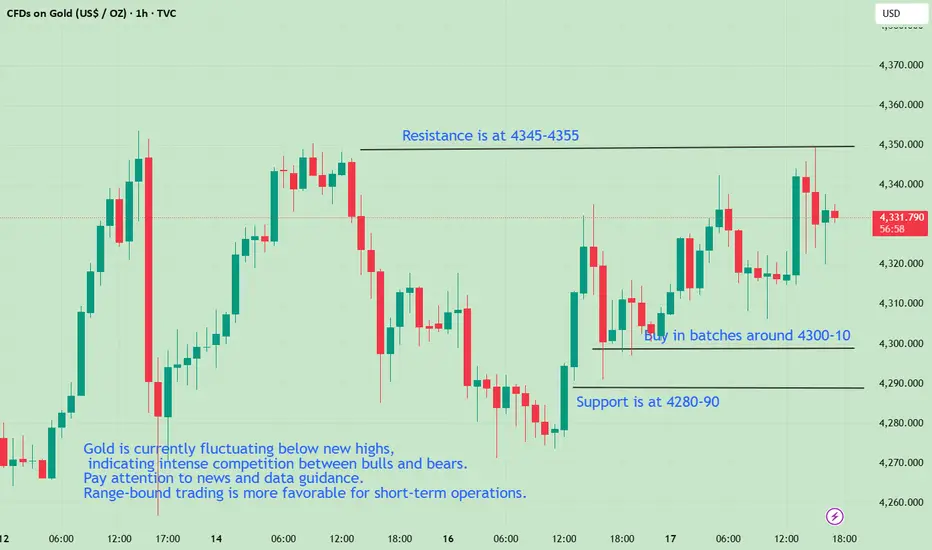 Gold fluctuated between 4320 and 4350 in Asian trading. Please be patient; the market is currently in a range-bound trading pattern. While gold maintains a strong upward trend, be aware of the potential for a correction, as the resistance level above 4350 is a historical resistance level. The market currently lacks effective catalysts, resulting in a lack of sustained upward or downward momentum in gold. We await US data to break the deadlock. The timing of a gold correction would be opportune, and a directional move could occur at any time. Then, follow the trend. Right now, we are waiting for confirmation. No amount of talk can compare to a single, achievable profit, or my ability to help you overcome long-standing problems. Perhaps some of my trading views can help you find the right investment direction. If you need to recover significant losses or obtain precise trading signals, please contact me.I love trading, I have a successful mindset, I have the best trading strategies, and I have sound money management.