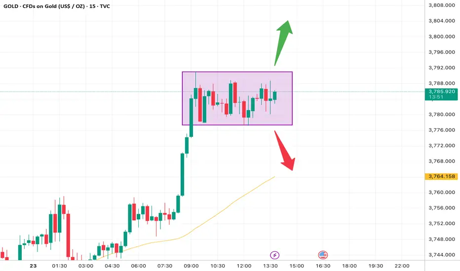 This is XAUUSD on the 15-minute chart. After a strong bullish impulse, price has entered a sideways consolidation range between 3780 – 3790 (purple box).