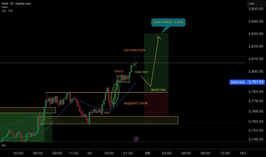 Market has consolidated, grabbed liquidity, and is ready to continue bullish momentum towards 3,830. Waiting for confirmation at rejection is key for high-probability setups.