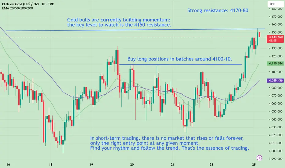 Market conditions change rapidly. We never blindly bullish or bearish. In short-term trading, there is no market that goes up or down forever, only the right entry point at any given moment. Find the rhythm and follow the trend. This is the essence of trading. Gold has broken upwards, so our strategy is to buy on dips. Gold is currently building momentum, and we'll see if it can break through the key resistance level of 4150. If gold continues to break upwards, further upside potential will open up, and gold bulls may push towards the strong resistance level of 4170-80.