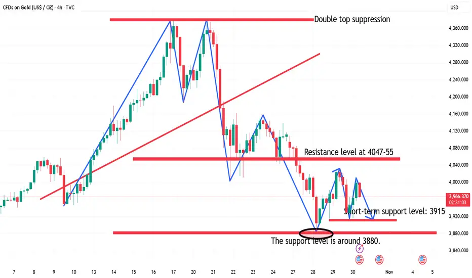 From a 4-hour chart perspective, the current short-term resistance level to watch is 3978-85, with a key resistance level at 4047-55. Short-term support is at 3915-20. Trading should focus on range trading; avoid chasing the market and patiently wait for key entry points.