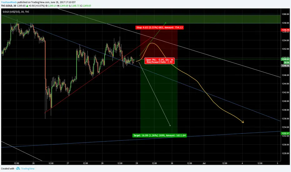 gold is taking its time to go down. I will wait an not get in right away but it will very likely hit trendline and go down once again. SL: 1256.53 TP: 1233.0