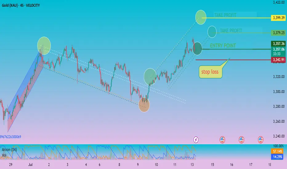 This chart is a technical analysis of Gold (XAU/USD) on a 45-minute timeframe using TradingView, as of July 14, 2025. It includes indicators, price action patterns, trend channels, and annotated trading levels.