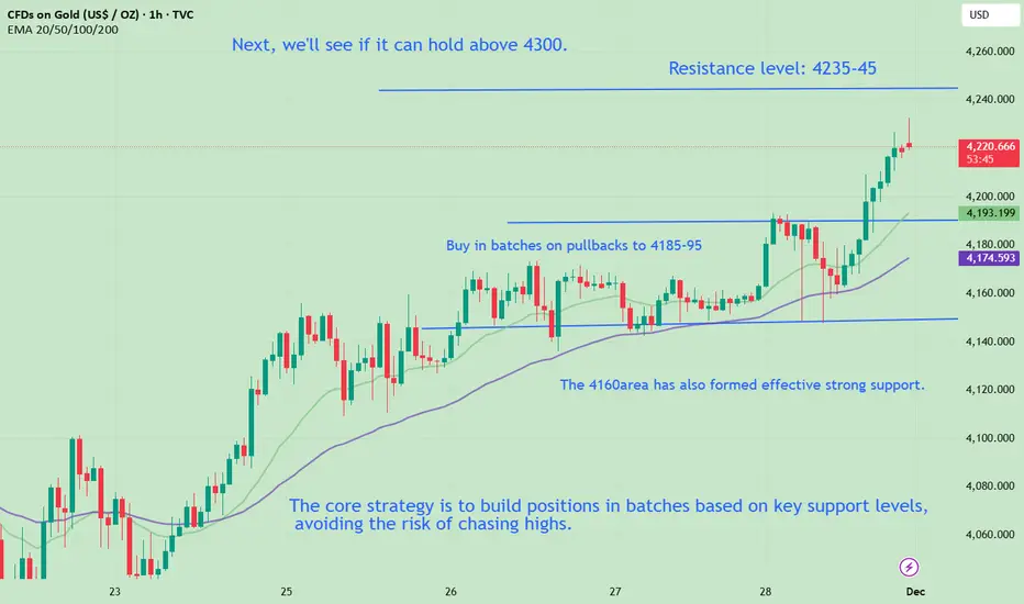 Based on last week's closing price, we continue to focus on the 4185-95 support level at the open. Our strategy is to buy on dips that hold above this level, with the core strategy being to build positions in batches based on key support levels. Looking at the 4-hour chart, the key resistance level to watch is 4235-45; avoid chasing highs. This is the overall strategy, and we will update it again based on the specific market conditions at the open. Market fluctuations are normal; maintain a calm attitude towards rises and falls. Let's work together next week to flexibly and steadily pursue greater profits in this unpredictable market.