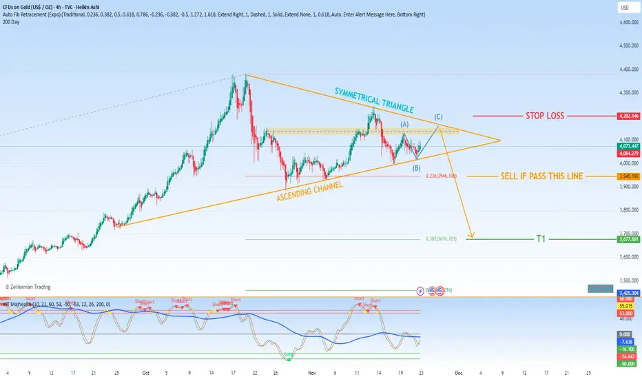 GOLD shows a bullish structure (Ascending Channel) undergoing consolidation (Symmetrical Triangle). Our base case is to wait for a bullish breakout. However, this plan specifically outlines the strategy for a bearish move: