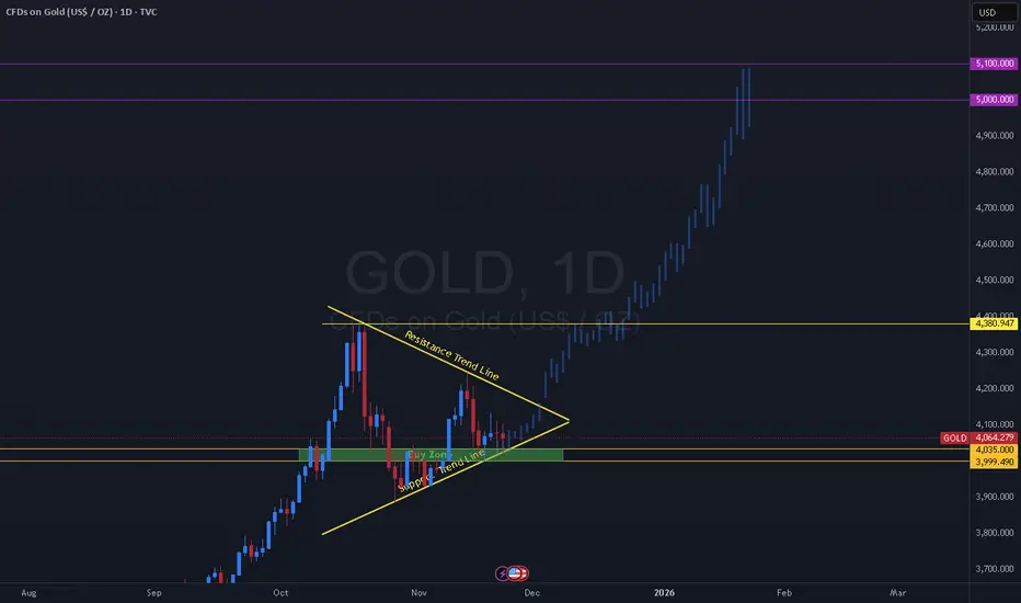 After the final retest of the support trendline, the price broke out aggressively to the upside, confirming a bullish continuation pattern. The breakout has since extended into a strong rally, with the price now targeting higher psychological levels.