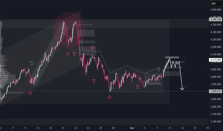 Gold is showing signs of exhaustion after the recent corrective bounce. The 3H market structure highlights a clear distribution pattern, as price continues to reject from the 4,135–4,250 supply zone. Repeated Break of Structure (BOS) signals that bearish momentum remains dominant.