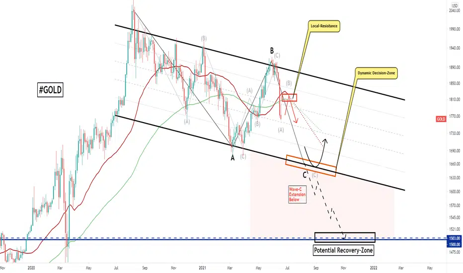 As GOLD recently moves below the 35- as well as 100-EMA marked in red and green these EMAs are now serious resistance in the structure marked in my chart with the local-resistance batch. In this level GOLD has now the resistance over which it firstly won't likely move that fast. Besides GOLD is in this coherent wave-count and almost already completed the waves A and B in the structure with the origin of wave B as the pullback from the upper resistance. Moving in this broader descending-channel-formation it is likely that GOLD will approach the lower boundary the next time as it did and is likely in such channel formations.
