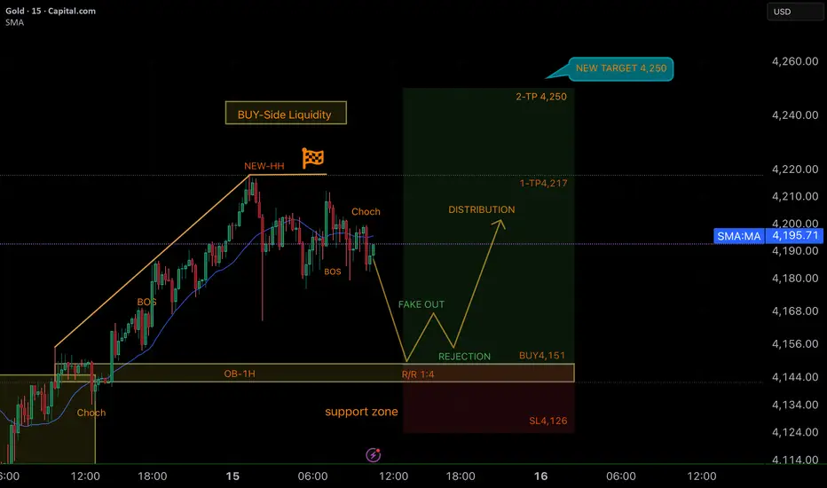 Your projection correctly anticipates a liquidity grab (fake out) into the OB, followed by a rejection—perfect institutional behavior for a bullish continuation setup.