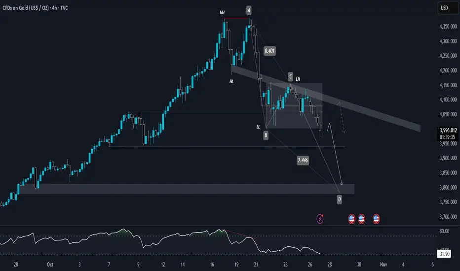 The price has now broken below the key accumulation range between 4000 and 4149, confirming a shift in sentiment. With the trend consistently printing lower lows (LL) and lower highs (LH), the overall market bias remains bearish.