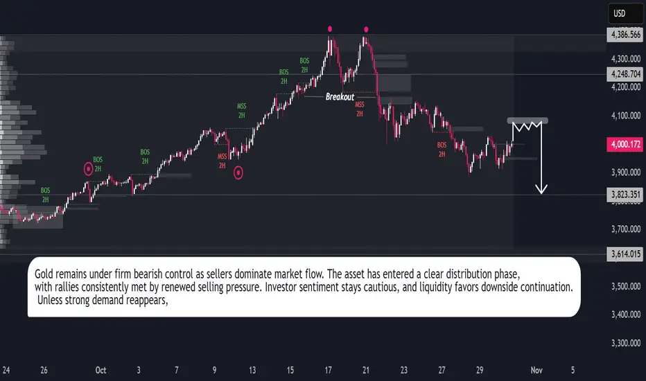 The broader outlook remains subdued, with market conditions favoring continued downside until clearer evidence of renewed demand emerges. Gold’s performance reflects a phase of market adjustment, where declining liquidity and moderate volatility reinforce the persistence of bearish sentiment across the short-term horizon.