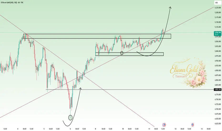 After sweeping liquidity near 4,660, buyers aggressively reclaimed structure and established bullish momentum. The pullback into 5,000 was absorbed, indicating strong demand continuation. Current price action shows compression beneath resistance, suggesting breakout potential if supply is cleared decisively.