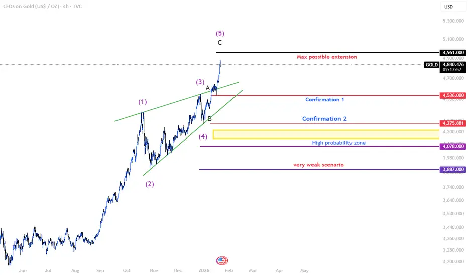 The "One Last Push" (Extension): If Wave 5 isn't finished, its possible to reach a final extension cluster between 4935 – 4965 (where Wave 5 equals Wave 3 length or 0.618x Wave 1).