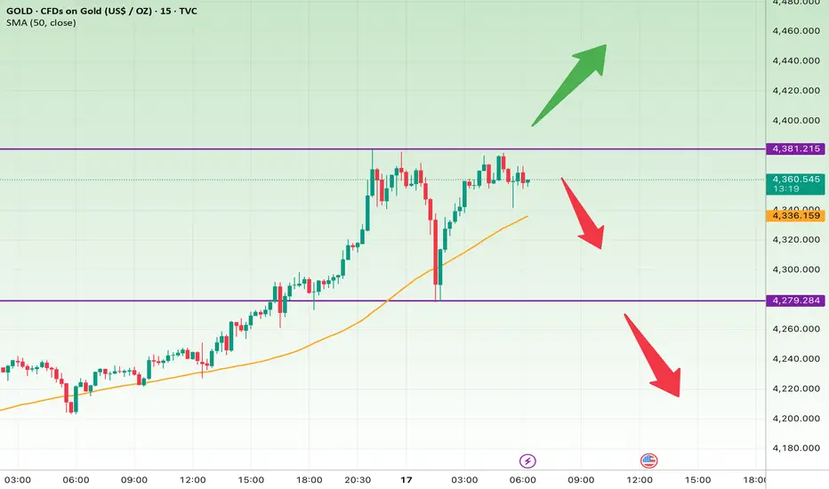 On the 15-minute gold chart, price is testing the key resistance around $4,381. This level has acted as a ceiling several times, suggesting strong selling pressure. The 50-period SMA at $4,234 still supports the broader uptrend, but momentum appears to be weakening near resistance.