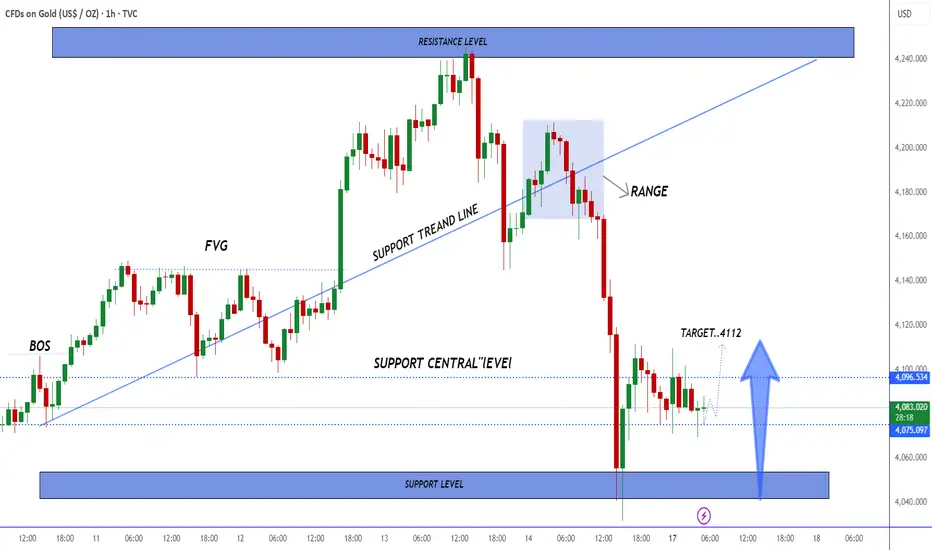 Gold has broken below the support trendline and tapped the major support zone. Price is now consolidating near the support level, indicating a possible bullish reaction. If buyers step in, the next upside target is around 4112, aligned with the previous intraday structure.
