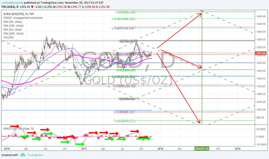 Gold chart with most plausible price scenarios to July 14 2018. MACD turned up maintains 200 MA.