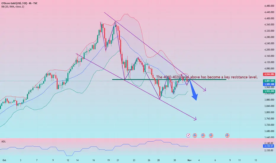 Gold prices fell on Friday, rising in Asian trading before retreating, fluctuating in European trading, and continuing to decline in US trading, closing with a small bearish candle. October's closing price formed a shooting star pattern with a bullish upper shadow; the longer the upper shadow, the more unfavorable it is for the bulls, and the probability of further declines in November is high. Fundamentally, the reopening of the US government, easing US-China relations, and the Federal Reserve's pause in rate cuts in December will all negatively impact gold prices. Therefore, the strategy for November is still to sell on rallies and look for a pullback. In the short term, judging from Friday's closing price, the 4030-4040 resistance level is effective, and a pullback is expected on Monday. The 4010-4020 level will become a key resistance level. If this resistance level is not broken, the outlook is bearish; conversely, if this resistance level is broken, a rebound is expected, and the 4030-4040 resistance level will become invalid.