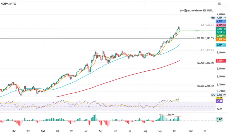 If this support zone, defined by the BBcenter and green line, manages to hold, price could push again toward $4,096, and possibly even extend to the projected “Next Move Beyond 161.8%” level around $4,446.