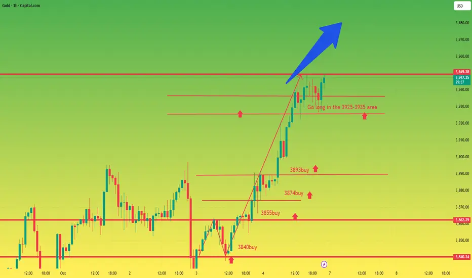 There is no highest, only higher, and the value of this sentence is still increasing. I have to admire my recent bullish thinking. Since gold's surge encountered resistance last week, ushering in a significant volatile market shakeout, as shown in the chart above, I've issued buy signals at 3840, 3855, 3874, 3893, and 3935, respectively. Last week, I predicted that the price would break through the 3900 mark this week. These series of trades and predictions have been fully validated by market trends. Newcomers can refer to my historical perspectives for verification.