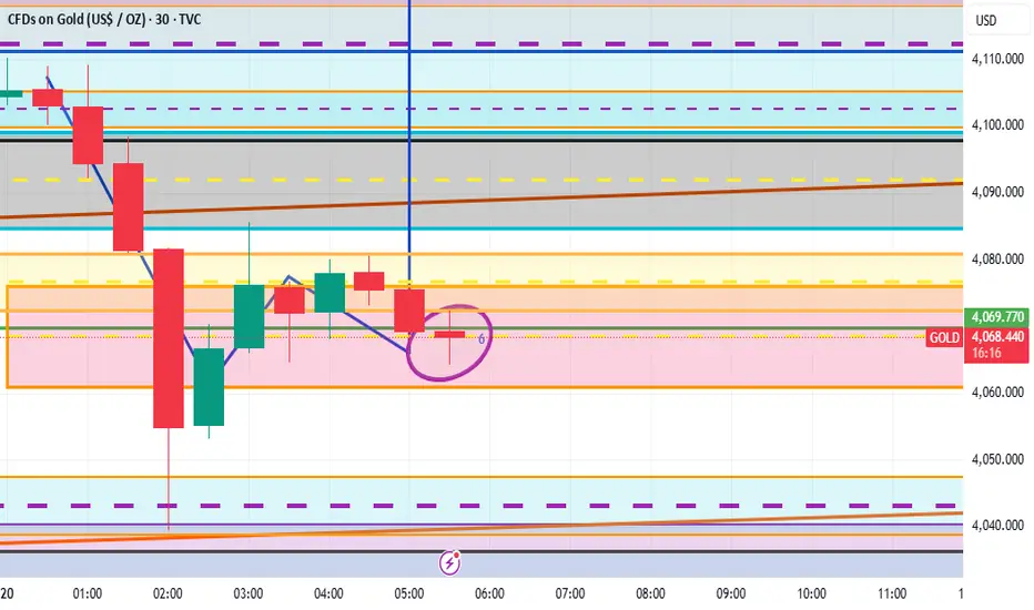 If this current m30 candle in the purple sphere closes bullish then it will be first good confirmation of more buys so we will wait for other higher time frames for more confirmation but if it closes bearish by 6am it will be best to close buys and wait for a while because it will push down further but could be rejected to close around 4070 before we buy again , it could also lead to more sells if it closes bearish so it will be best to close and wait for the reaction after that .