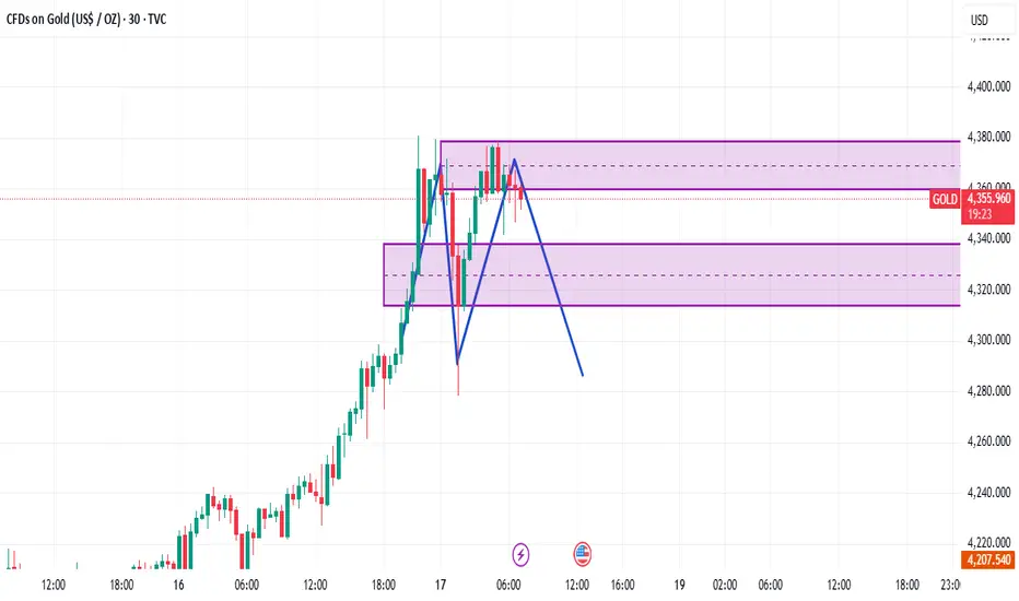 It looks like gold is likely to sell a bit further but lower rectangular block could cause price to resume the bullish trend so it's a tricky area to trade but it's favorable to buy at lower block than selling but if it's able to move below the lower block then you can confidently sell.