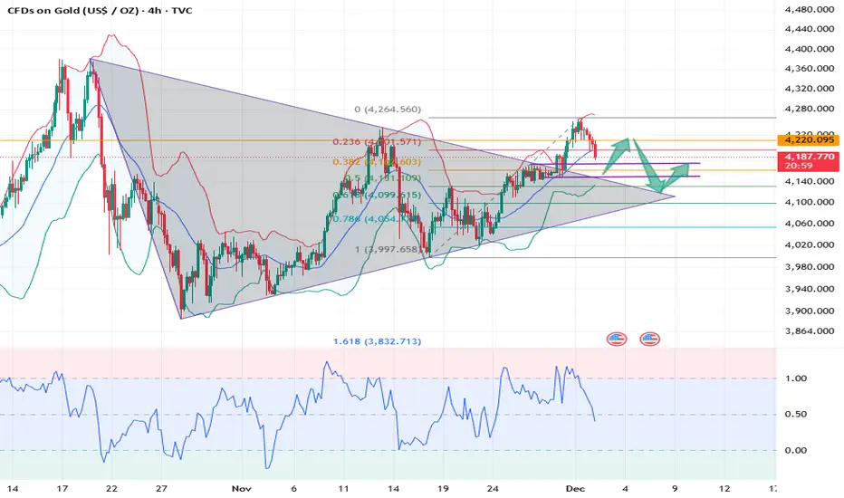Yesterday, the gold market exhibited significant volatility. Gold prices surged, reaching a high of around 4264, demonstrating strong upward momentum. However, upon entering the New York session, the market sentiment shifted dramatically, and gold prices began to fluctuate and decline. The 4-hour chart shows that gold has successfully broken out of a clear symmetrical triangle pattern, a breakout signal indicating a continuation of the bullish trend. Although momentum has improved after the breakout, the RSI indicator remains in overbought territory around 65, making chasing the price higher risky in the short term. The short-term battleground between bulls and bears is around 4200.