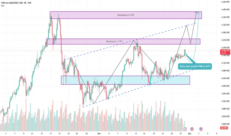 The price action since late October appears to be moving within an **ascending channel** (indicated by the dashed blue lines), which suggests a bullish bias as long as the price remains within or above the channel's lower boundary. The current price action shows a move up from the lower boundary towards the Resistance 1/TP1 zone.