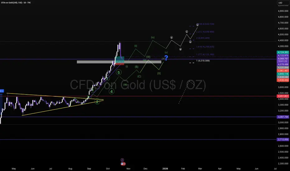 Gold reached a new all-time high at 4381, marking the potential completion of wave (5) within the broader impulsive cycle.