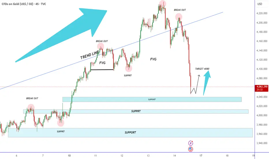 “Gold Price Analysis: After a sharp drop into major support, price is expected to react from the trendline zone with a potential bounce toward the 4080 target. Chart highlights breakouts, FVGs, trendline structure, and key support levels.”