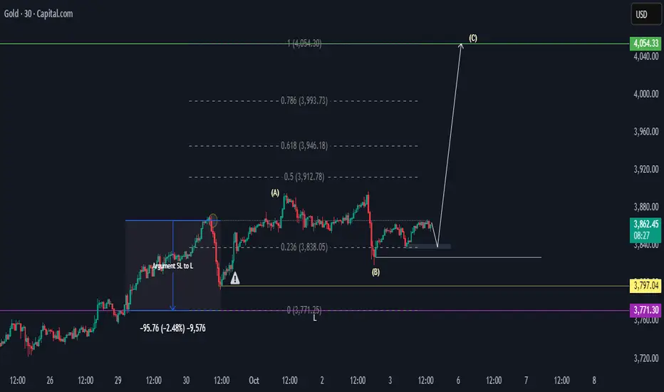 Gold on the M30 timeframe looks potentially bullish. We have three price targets, with a bias toward 4054.33, forming what appears to be an ABC pattern. If the price falls and breaks the 3771.30 level, this setup will be invalidated.