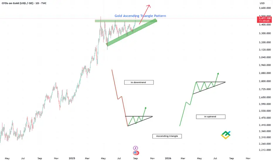 Gold is coiling up for a major move. The daily chart reveals a classic Ascending Triangle, a powerful bullish continuation pattern, suggesting the uptrend is ready to resume.