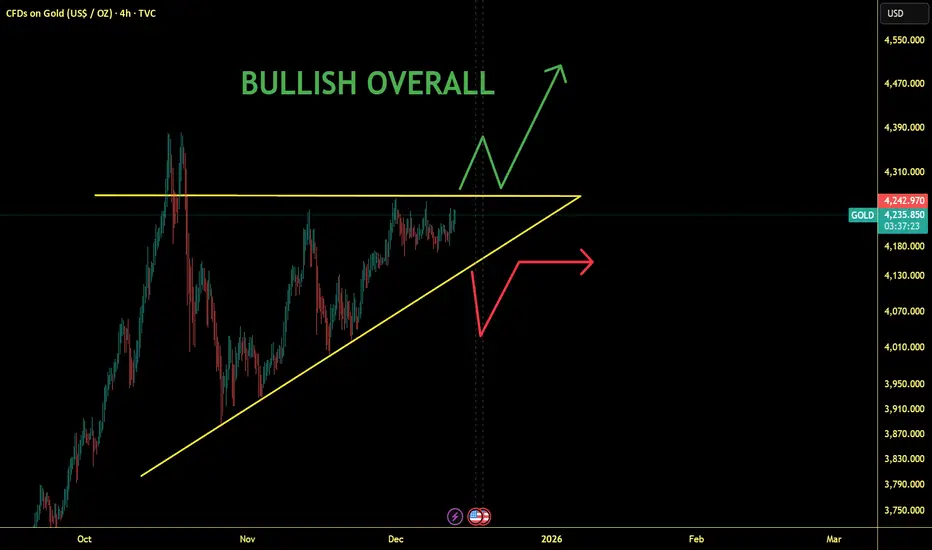 If the rising trendline fails, the pattern would break down and a deeper pullback could follow, but the prevailing trend and current structure still lean toward strength. Overall, the chart supports the idea that gold is on the verge of a significant move, with the pressure building in favor of an upside breakout.