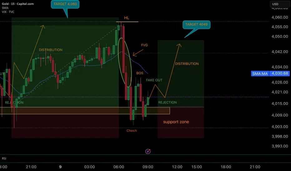 • After the push into the distribution zone and reaching 4,060, price formed a higher low (HL) before dropping with a Break of Structure (BOS).