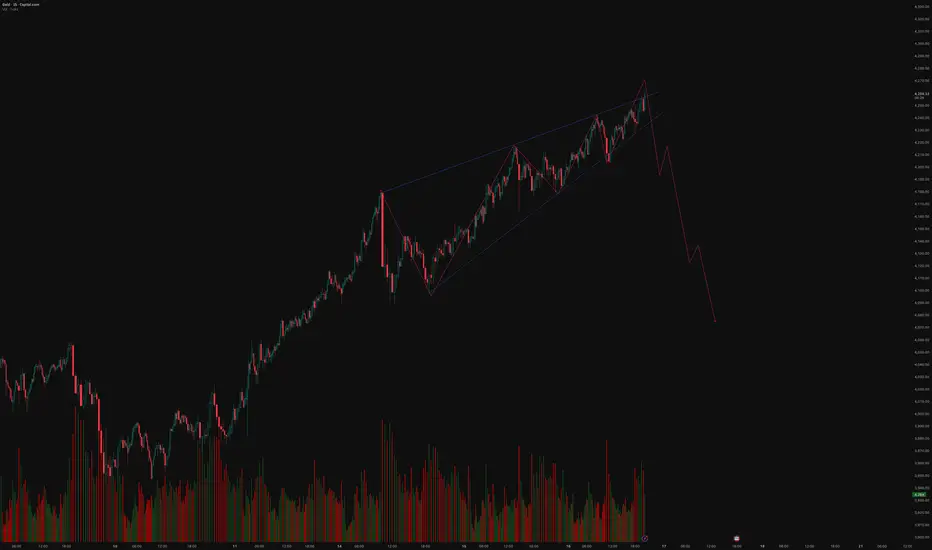 Pattern: A rising wedge has formed with converging trendlines — higher highs and higher lows narrowing into the apex.
