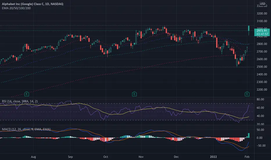Alphabet is trading above the eight-day and 21-day exponential moving averages (EMAs) and the eight-day EMA is about to cross above the 21-day, both of which are bullish indicators. On Wednesday, the stock was able to pop up above the 50-day simple moving average as well, which indicates longer-term sentiment is now bullish.