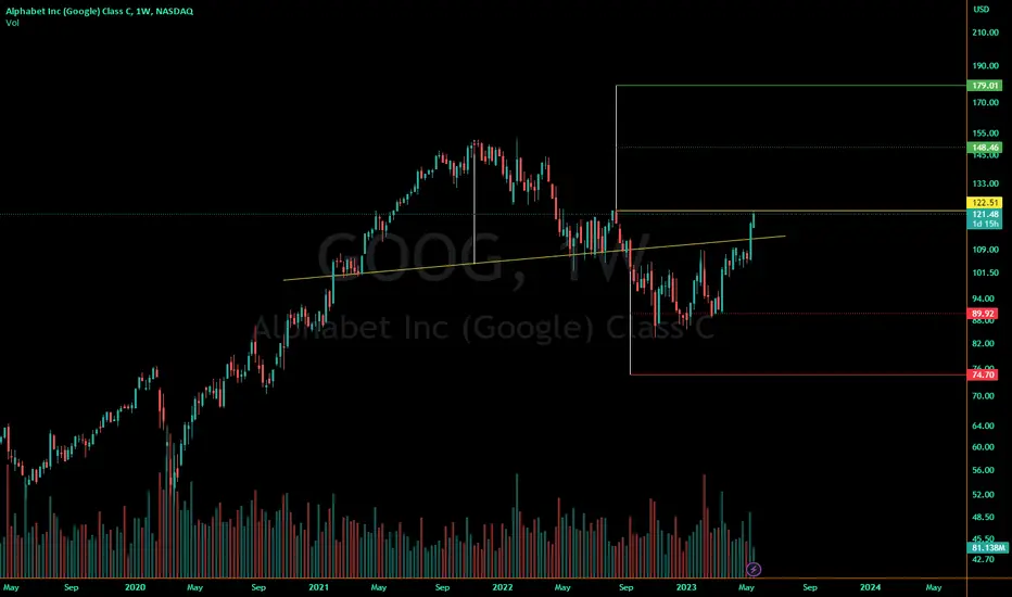 Move and hold above 122 and Google will see ATH again, possibly a new ATH near 180. Remain below 122 and lose the 2nd yellow line below it, and it's headed back down to recent lows and lower.