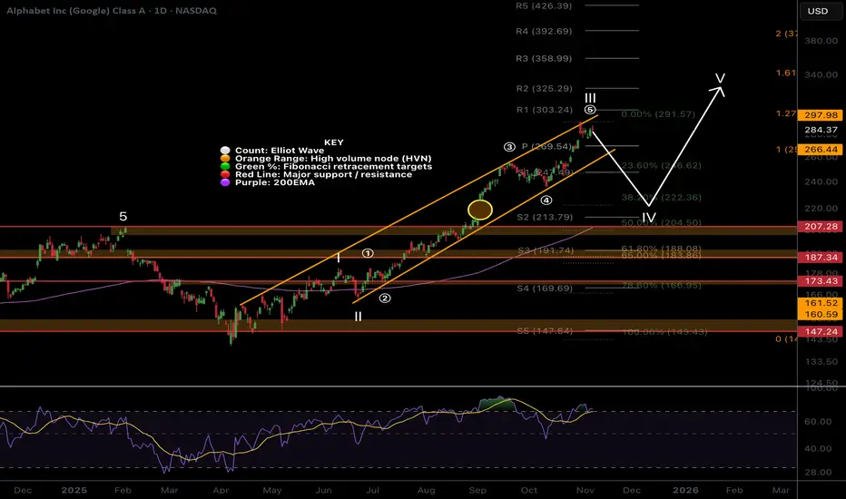 Wave (5) of III is likely to complete with a throw-over of the upper channel boundary. Wave IV has an expected retracement target of the 0.382, $222, filling the gap left and meeting the daily 200EMA.