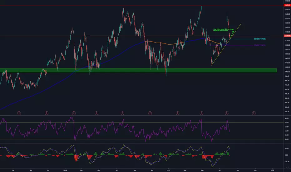 After great Q2 earnings Alphabet soared, but now gap is closed and retraced. Testing the uptrend line again at the 50% Fibonacci level. Could wait and see if the line breaks and we test 61.8% and 200SMA on a daily chart.