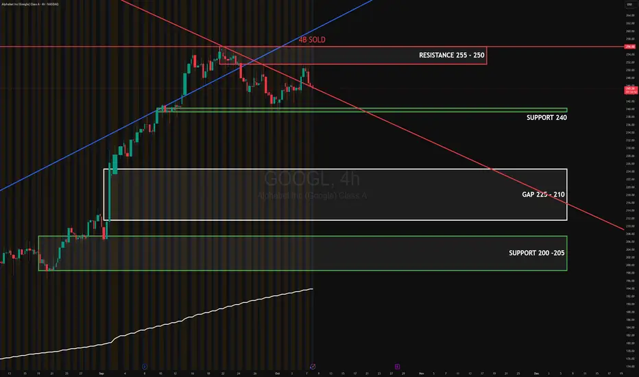 GOOGL (4H) rejected the 255–250 supply and is back under the descending trendline. Demand is defending 240; acceptance below it likely opens the open gap toward 225–210. Prior heavy sell program near 250–255 signals distribution; watch for absorption at 240 to gauge a bounce vs. continuation.