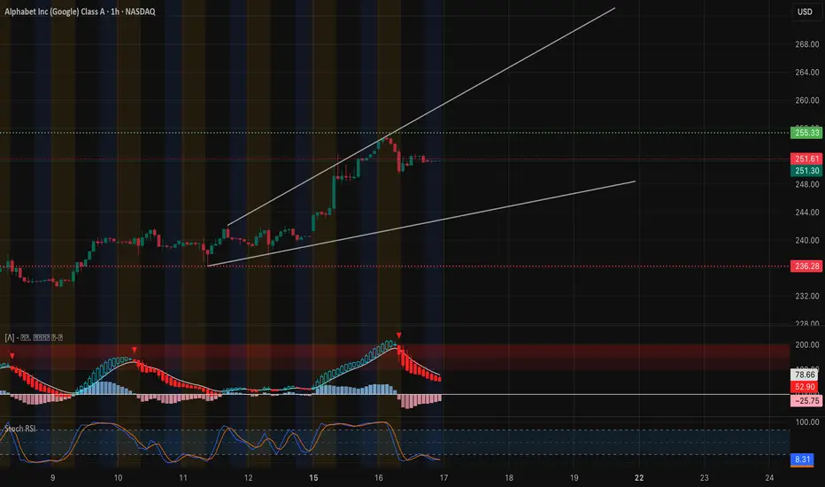 Alphabet’s 1-hour chart shows a strong early-September rally followed by a controlled pullback. Price reached the $256 area and is now consolidating around $251. MACD has cooled sharply from overbought and Stoch RSI is at low levels, suggesting a near-term reset inside an intact rising channel.