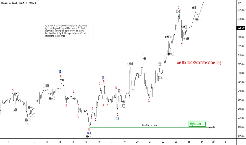The short-term Elliott Wave view in Google (GOOGL) indicates that the stock is progressing within the final wave ((5)) of the impulsive rally that began from the April 2025 low. Wave ((4)) of this sequence concluded at $270.1, as reflected in the 45-minute chart. Following that completion, the stock resumed its advance toward new all-time highs, unfolding wave ((5)) as a five-wave impulse of lesser degree. From the termination of wave ((4)), wave (1) reached $293.95, while the corrective pullback in wave (2) settled at $278.2. The structure then nested higher into wave (3), reinforcing the bullish momentum.